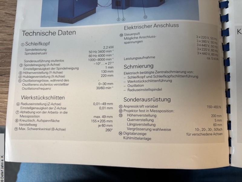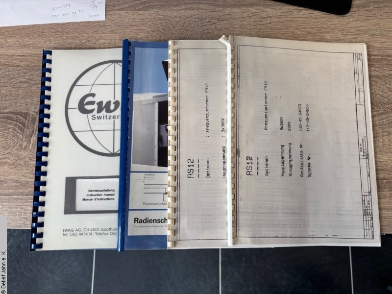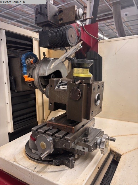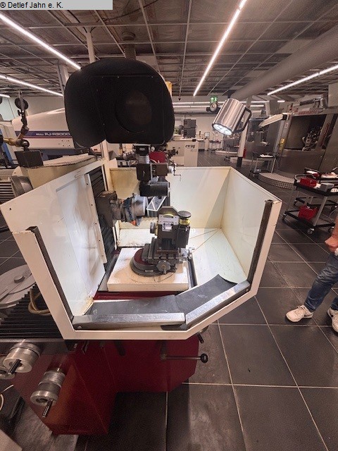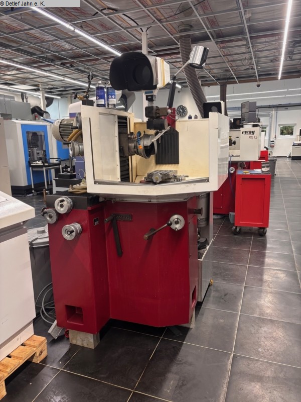 EWAG RS 12 universal grinding machine, built in 1989, technically and visually in good condition Grinding head: - Motor power: 2.2 kW - Spindle speeds: 1,000 - 8,000 rpm - Spindle inclination (A axis): -10° to +27° - Adjustment accuracy 1 min - Height adjustment (Y axis): 130 mm - Stroke range (X axis): 220 mm - Oscillation stroke, continuously adjustable during oscillation: 0-30 mm - Oscillation frequency: 30/60 rpm Workpiece slide: - Radius adjustment (Z axis): 0.01-49 mm - Adjustment accuracy: 0.01 mm - Retraction of the slide from the grinding to the measuring position: max. 49 mm - Cross table, clamping surface: 155 x 205 mm - Adjustment range X - Y: 60 mm each - Maximum swivel angle (B axis): 260° - Connection voltage: 380 V - Weight: 1200 kg Several grinding discs are supplied, but not the workpiece holder shown in the picture. |
